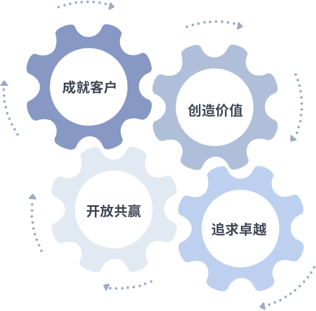成就客户是一切决策的出发点,,创造价值是衡量所有工作的标准,,,追求卓越是我们做事做人的态度,,开放共赢是我们的格局也是最终的结果。。。。价值观的齿轮环环相扣,,推动着组织里的每个人不断向前。。。。